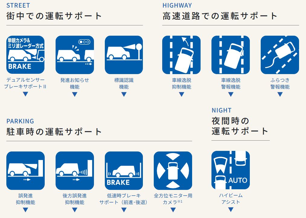 さらに、車線逸脱警報やふらつき警報機能も備えており、長距離運転でもしっかりサポート。ご家族を乗せる機会が多い方にもおすすめです。
